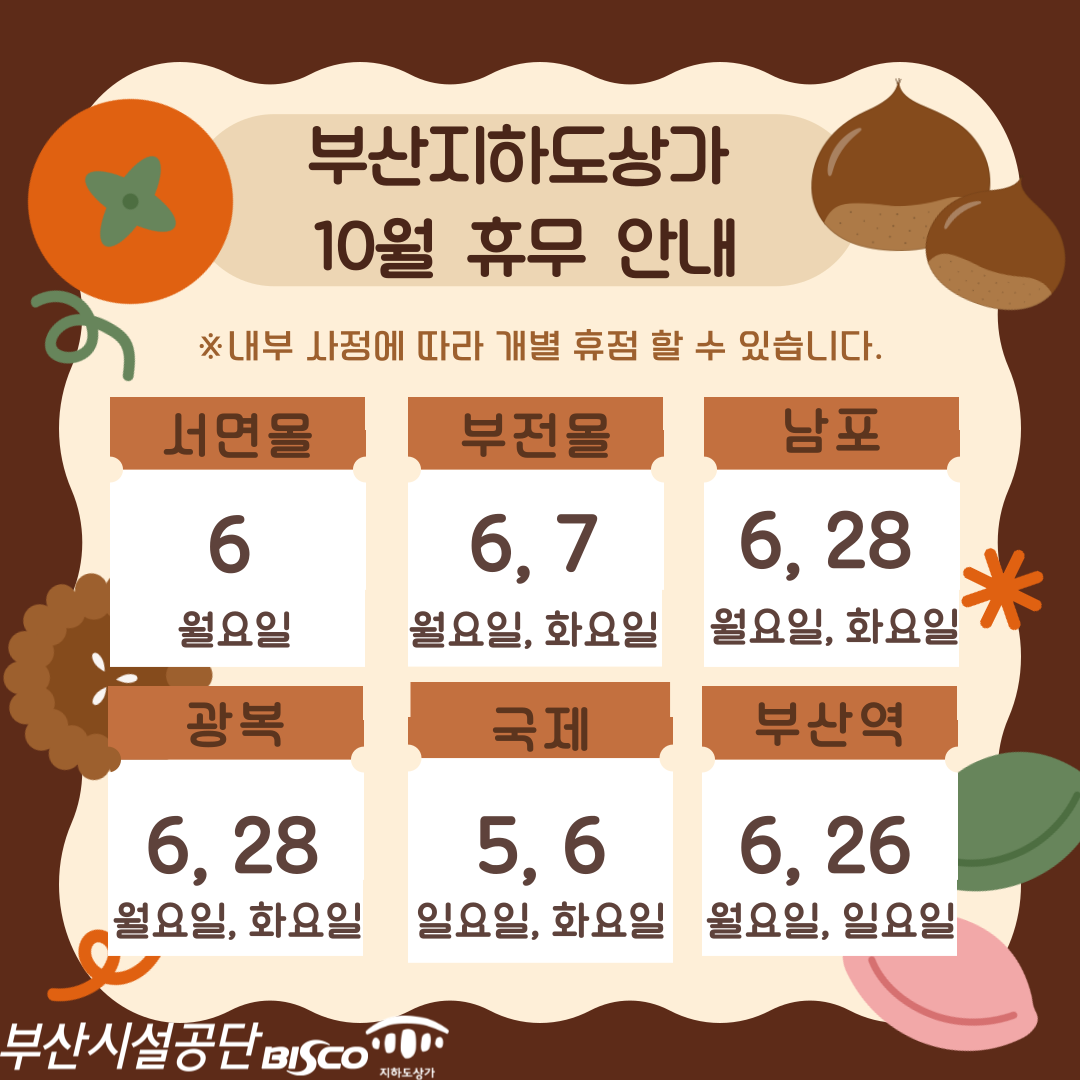 📢 부산시설공단 지하도상가 10월 휴무일 알려드립니다 !
